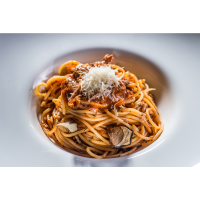 spaghete, sos de roşii, ciuperci uscate, parmezan, piper, sare, smântână, ulei de măsline, usturoi