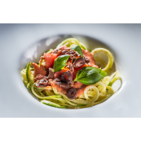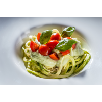 paste din dovlecel, roşii cherry, fulgi drojdie, sos avocado, smântână caju, ulei de măsline, lămâie, sare, piper