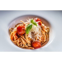 busuioc, ceapă albă, parmezan, piper, roşii cherry, sare, sos de roşii, spaghete, ulei măsline extra virgin, usturoi