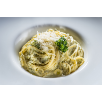 hribi uscati, pătrunjel, parmezan, smântână, spaghete, ulei măsline extra virgin, usturoi