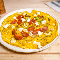 350 g, Ouă 150 g, zucchini 70 g, roșii cherry 70 g, telemea de capră 30 g, unt 25 g, mărar proaspăt, ulei de măsline