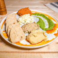 350 g, Ciabatta 150 g, hummus 50 g, muhammara 50 g, cremă de ouă 50 g, cremă de ton cu chili 50 g