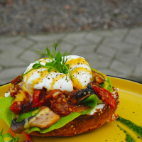 Chiflă burger 40 g, ouă 50 g, ciuperci 100 g, roșii uscate 50 g, sos olandez 30 g, cremă de brânză, sos chimichurri