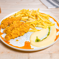 400 g, Piept de pui 200 g, cartofi prăjiți 130 g, ouă 50 g, sos aioli, făină albă, fulgi de porumb