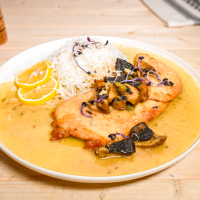 450 g, File de pui 150 g, vin alb sec 100 ml, orez 70 g, ciuperci 70 g, usturoi 50 g, capere, lămâie, făină albă
