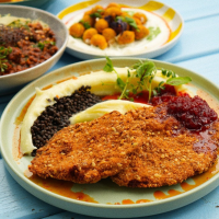 Cotlet alb 150 g, piure de cartofi cu ulei de trufe 150 g, linte neagră 80 g, dulceață de ardei iute 50 g, nuci 30 g, pesmet auriu