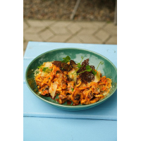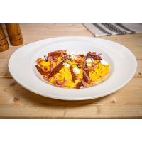 Spaghetti 200 g, cremă de dovleac 80 g, cremă de gătit 40 g, bacon 30 g, brânză de oaie 30 g, roșii uscate 20 g, ulei aromatizate