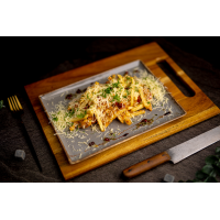 Cartofi prăjiți, bacon, cașcaval, brânză cu mucegai, ciuperci, castraveți murați, cremă de gătit