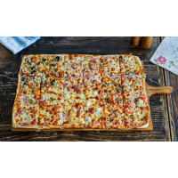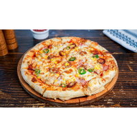 Blat pizza , sos pizza,mozzarella, sunca, bacon, carnati, piept de pui, ardei, ardei iute