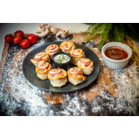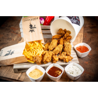 fâșii din piept de pui în crustă crocantă 300 g, aripi de pui în crustă crocantă 300 g, cartofi prăjiți 300 g , 2 sosuri la alegere