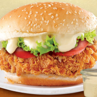 piept de pui crispy, chiflă burger, cașcaval cheddar, castraveți murați, salată, sos burger, cartofi prăjiți, băutură răcoritoare la alegere