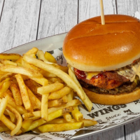 carne de vită și carne de porc, chiflă burger, cașcaval cheddar, roșii, ceapă prăjită, salată, sos bbq, sos burger , cartofi prăjiți, băutură răcoritoare la alegere