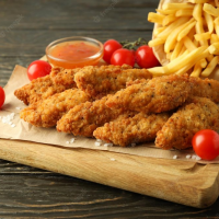 piept de pui sau aripi de pui crispy, 3 porții de cartofi prăjiți, 3 sosuri la alegere