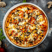 blat pizza, sos pizza, mozzarella, ciuperci, ardei, porumb, ceapă, mazăre verde pizzatészta, pizzaszósz, mozzarella, gomba, paprika, kukorica, hagyma, zöldborsó