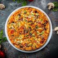 blat pizza, sos gyros, mozzarella, ciuperci, roșii, ceapă roșie, castraveți, sos de usturoi pizzalap, gyros szósz, mozzarella, gomba, paradicsom, lilahagyma, uborka, fokhagymaszósz