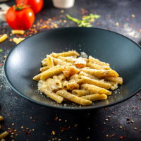 paste, sos alb (contine lapte) 200 g, kaiser 70 g, branza dura razuita 15 g, condimente