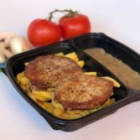 piept de pui sau cotlet de porc, bacon, ciuperci, sos alb (contine lapte), garnitură la alegere