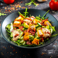salată, piept de pui, fulgi de porumb, bacon, roşii, castraveţi, sos mayo rose saláta, rukkola saláta, csirkemell, kukoricapehely, császárszalonna, paradicsom, uborka, mayo rose öntet