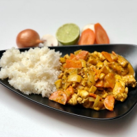 carne la alegere, pastă de curry thai galben ușor picantă, morcovi, ceapă, ciuperci, lapte de cocos, ghimbir, usturoi, Lime, orez Jasmine csirkemell, enyhén pikáns thai sárga curry, sárgarépa, hagyma, gomba, kókusztej, gyömbér, lime, fokhagyma