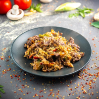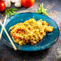 carne la alegere, pastă de curry thai galben ușor picantă, morcovi, ceapă, ciuperci, lapte de cocos, ghimbir, usturoi, Lime, orez Jasmine csirkemell, enyhén pikáns thai sárga curry, sárgarépa, hagyma, gomba, kókusztej, gyömbér, lime, fokhagyma