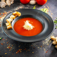 supă cremă de roșii mediteranean cu busuioc, parmezan și crutoane