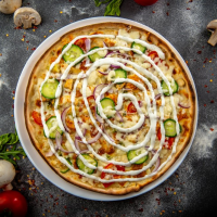blat pizza, sos gyros, mozzarella, ciuperci, roșii, ceapă roșie, castraveți, sos de usturoi pizzalap, gyros szósz, mozzarella, gomba, paradicsom, lilahagyma, uborka, fokhagymaszósz