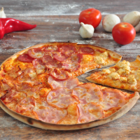 Blat pizza, sos pizza, mozzarella, carne de pui, cașcaval chedar, castraveți murați, roșii, salată, sos burger, sos bbq / pizzatészta, pizzaszósz, mozzarella, csirkehús, chedar sajt, savanyú uborka, paradicsom, burger szósz, saláta, bbq szósz