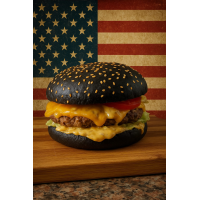 Carne de vită Angus +Cașcaval cu mucegai albastru + Cașcaval Cheddar + Salată Iceberg + Roșii + Ciuperci la grătar , sos de maioneză , chiflă neagră Angus marhahús burger + Kèkpenèszes sajt+ Cheddar Sajt + Iceberg saláta + Paradicsom + Grillezett Gomba , majonèz , fekete zsemle