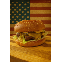 Carne de vită Angus + 2x Cascaval Cheddar +Ceapa Caramelizata + Salată Iceberg + Roșii + Castraveți murati + Sos clasic hamburger