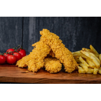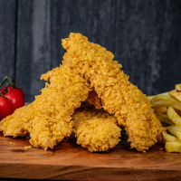 5 buc Piept de pui marinat in crusta crocanta , sos de usturoi . cartofi prajiti