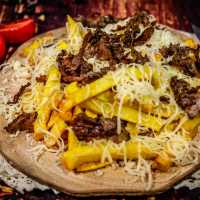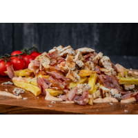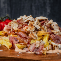 Cartofi prăjiți cu cașcaval bacon si pui , sosul casei