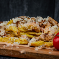 Cartofi prăjiți cu cașcaval , piept de pui , sosul casei