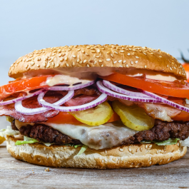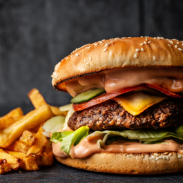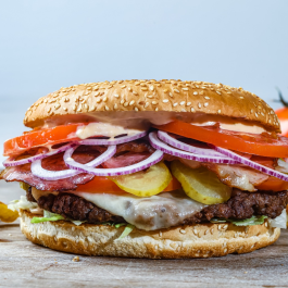 Angus marhahús burger 250gr + Bacon + Sajt + Iceberg saláta + Paradicsom + Savanyú uborka + Hagyma + Házi szósz +160 as zsemle+ 200g Szalmakrumpli