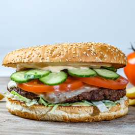 Angus marhahús burger 250gr + Sajt + Iceberg saláta + Paradicsom + Uborka + Házi szósz + 160 as zsemle +200g Szalmakrumpli