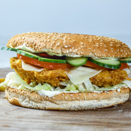 Panirozott csirkelmell 250gr + Sajt + Iceberg saláta + gogos paprika + Uborka + Majonez + Fokhagymaszósz + 160 as zsemle +200g Szalmakrumpli