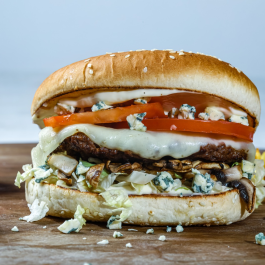 Angus marhahús burger + Cheddar Sajt + Iceberg saláta + Paradicsom + Grillezett Gomba , majonèz + 200g Szalmakrumpli
