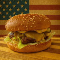 Angus marhahús burger + Dupla Cheddar Sajt + Iceberg saláta + Paradicsom + Savanyú uborka + Karamelizalt Hagyma + Klasszikus Hamburger Szósz