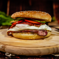 Bacon+ Tojás + Sajt + Iceberg saláta + Paradicsom + Uborka + Házi szósz
