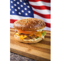 Carne de vită Angus + 2x Cascaval Cheddar +Ceapa Caramelizata + Salată Iceberg + Roșii + Castraveți murati + Sos clasic hamburger