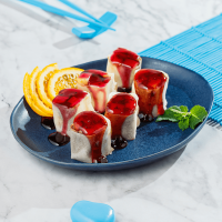 Spring rolls (produs decongelat) (14g), cremă de brânză dulce (22g), zahar pudra (8g), cremă de cacao/nutella (20g), mango (40g), kiwi (40g), portocală (40g), topping în sortiment - ciocolată/visină/capsună (30g) - 214g. (6 buc.)