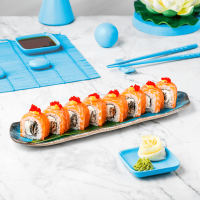 Orez (120g), somon (90g), avocado (20g), castravete (20g), cremă de brânză (20g), sos picant (10g), icre somon (8g), alge nori (1g) - 289g. (8 buc.)
