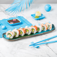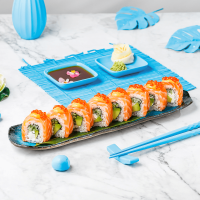 Adițional (porționat): Sos de soia-30ml (Alergen:SOIA), Wasabi-5g (Alergen:MUȘTAR), Ghimbir murat-10g, Bețe sushi-1buc.