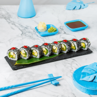 Adițional (porționat): Sos de soia-30ml (Alergen:SOIA), Wasabi-5g (Alergen:MUȘTAR), Ghimbir murat-10g, Bețe sushi-1buc.