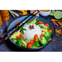 Orez Jasmine, legume proaspete, usturoi și sos de soia. | Jasmine rice, fresh vegetables, garlic and soy sauce