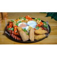 carnaciori , crispy, cascaval pane, aripioare de pui, mititei,cartofi prajiti,sos usturoi, mustar,sosul casei