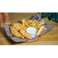 Piept de pui crispy, cartofi prăjiți, sos de usturoi