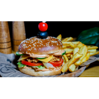 Chiflă burger, piept de pui crispy, salată, castraveți murați, roșii, ceapă roșie, cașcaval, sos burger și cartofi prăjiți