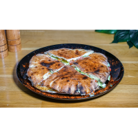 Homemade focaccia, crispy pui, salată iceberg, roșii, castravete, sos
