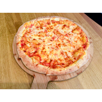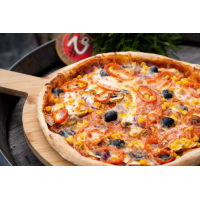blat pizza, sos rosii, mozzarella, sunca,ciuperci, ardei rosu, masline