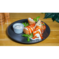 carne tocată de pui, ou, făina, cașcaval, usturoi granulat, sos de smântâna, ketchup, sos tar tar